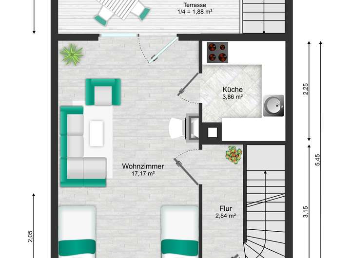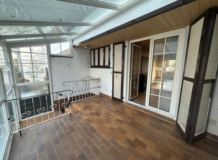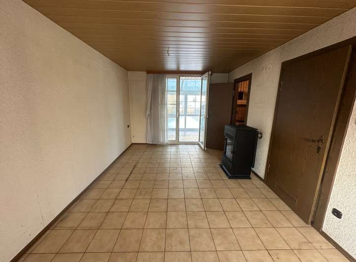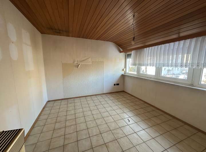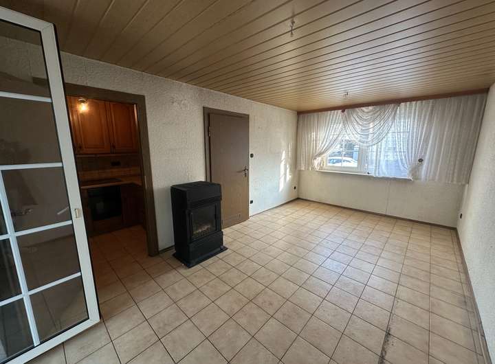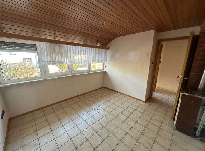 Im Erdgeschoss befindet sich das Wohnzimmer mit Zugang zur Terrasse und einem vorhandenen Wintergarten. Von hier aus blickt man in den Garten. Es besteht die Möglichkeit, den Wintergarten zu einem Warmwintergarten umzubauen oder alternativ einen neuen Anbau zu errichten, um die Wohnfläche zu erweitern. Ein vergleichbarer Ausbau wurde in der direkten Nachbarschaft bereits realisiert. Ergänzt wird das Erdgeschoss durch eine kleine Küche.