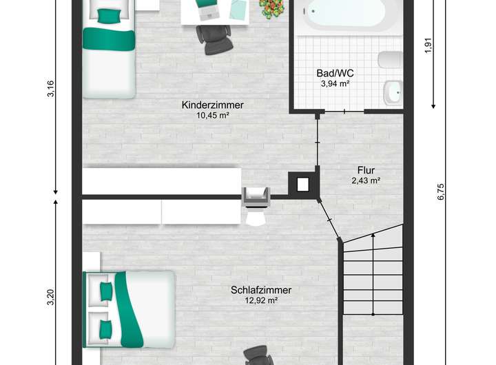 Das Obergeschoss verfügt über zwei Schlafzimmer sowie ein Tageslichtbad.