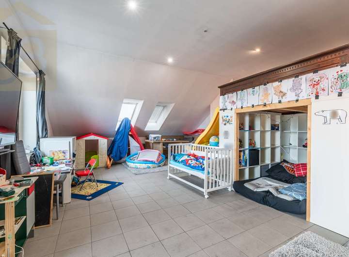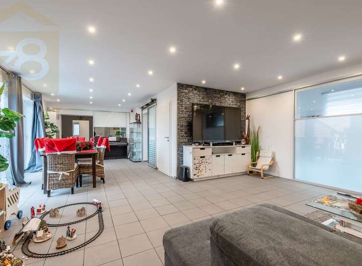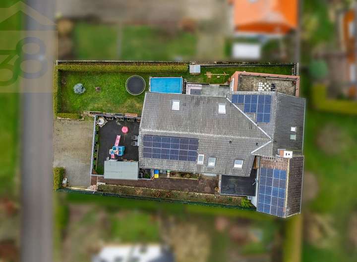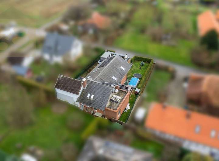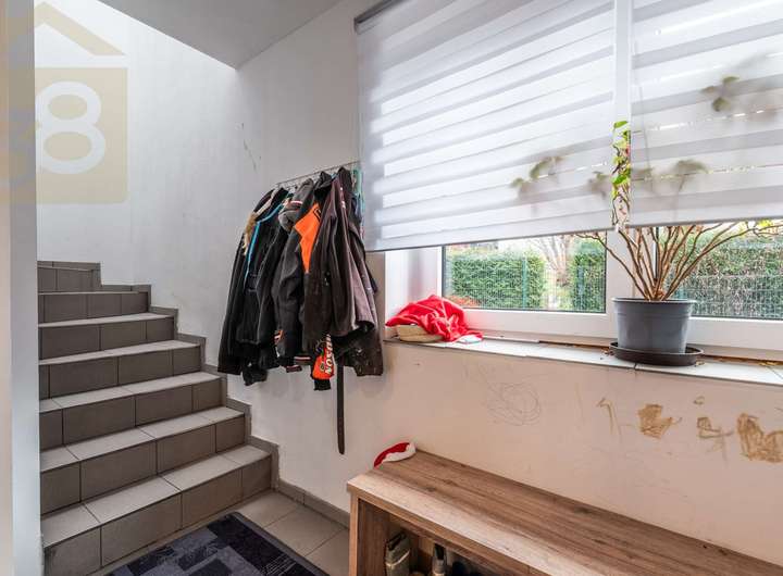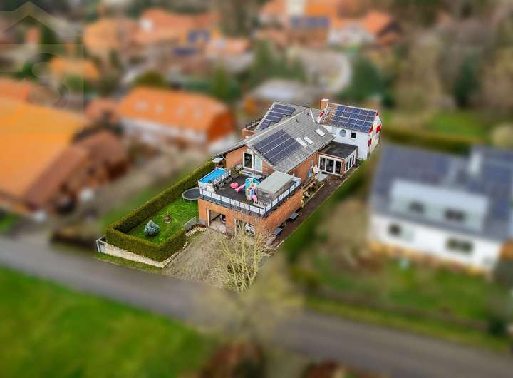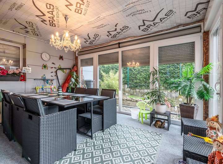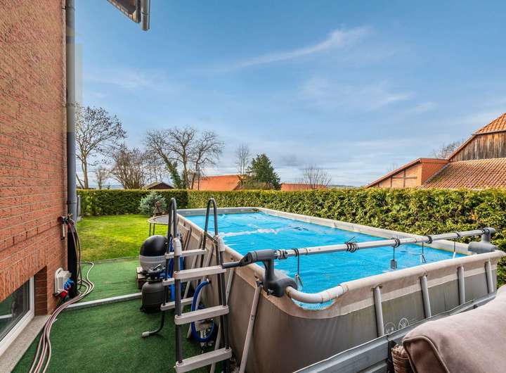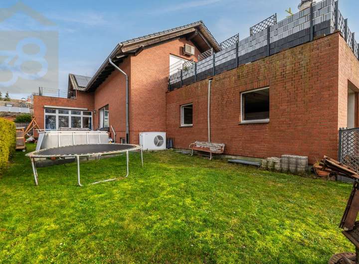 Das Erdgeschoss umfasst fünf Zimmer und bietet eine geräumige Küche mit Einbauküche, ein Badezimmer mit Dusche sowie direkten Zugang zur Terrasse und zum liebevoll angelegten Garten. Der Außenbereich ist ein echtes Highlight der Immobilie: Ein Pool, großzügige Grünflächen und Rückzugsmöglichkeiten schaffen eine private Wohlfühloase. Der Wintergarten erweitert den Wohnraum und ermöglicht zu jeder Jahreszeit einen Blick ins Grüne. Das Obergeschoss verfügt über ein großzügiges Wohn- und Esszimmer, ein Schlafzimmer sowie zwei weitere Zimmer, die sich ideal als Kinder-, Gäste- oder Arbeitszimmer nutzen lassen. Ergänzt wird diese Etage durch ein vollwertiges Badezimmer, einen Flur sowie einen praktischen Abstellraum. Insgesamt sind zwei Einbauküchen vorhanden, was die flexible Nutzung der Wohneinheiten zusätzlich unterstreicht.