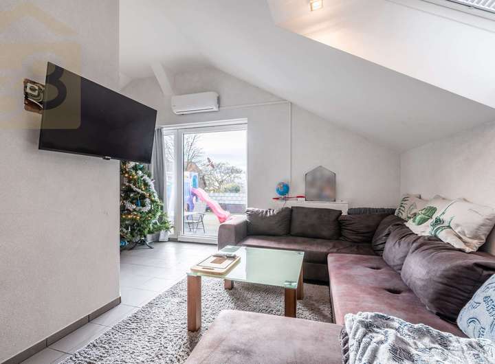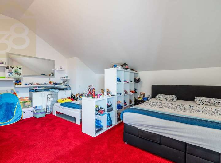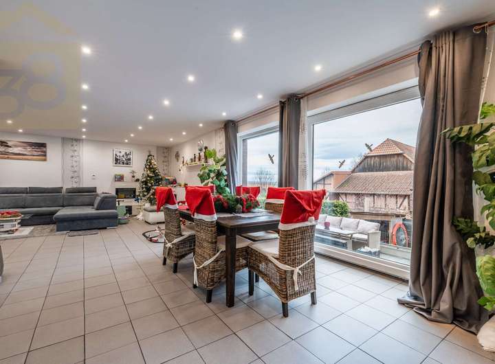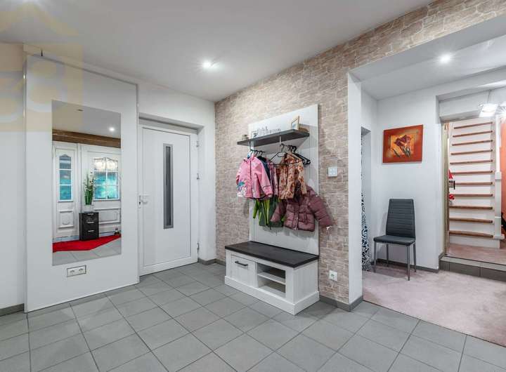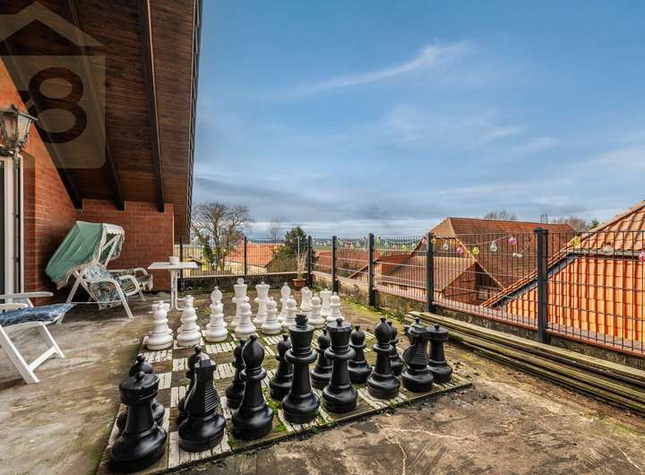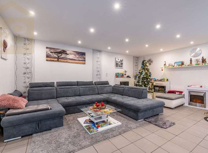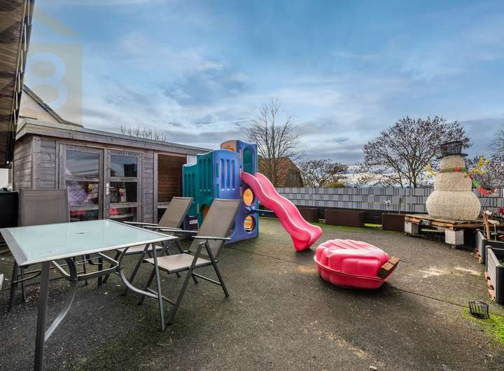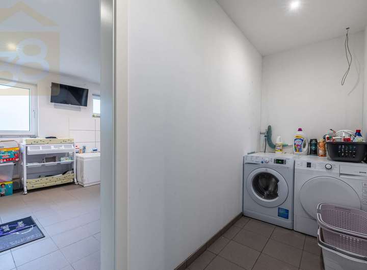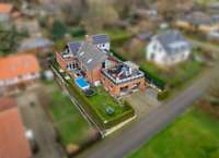 Das Erdgeschoss umfasst fünf Zimmer und bietet eine geräumige Küche mit Einbauküche, ein Badezimmer mit Dusche sowie direkten Zugang zur Terrasse und zum liebevoll angelegten Garten. Der Außenbereich ist ein echtes Highlight der Immobilie: Ein Pool, großzügige Grünflächen und Rückzugsmöglichkeiten schaffen eine private Wohlfühloase. Der Wintergarten erweitert den Wohnraum und ermöglicht zu jeder Jahreszeit einen Blick ins Grüne. Das Obergeschoss verfügt über ein großzügiges Wohn- und Esszimmer, ein Schlafzimmer sowie zwei weitere Zimmer, die sich ideal als Kinder-, Gäste- oder Arbeitszimmer nutzen lassen. Ergänzt wird diese Etage durch ein vollwertiges Badezimmer, einen Flur sowie einen praktischen Abstellraum. Insgesamt sind zwei Einbauküchen vorhanden, was die flexible Nutzung der Wohneinheiten zusätzlich unterstreicht.