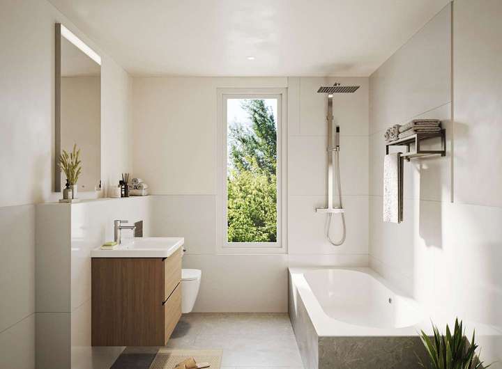 In allen Räumen sorgt edles Eichenparkett in Kombination mit einer angenehm temperierten Fußbodenheizung für ein behagliches Wohngefühl. Die Bäder überzeugen mit großformatigen Fliesen von bis zu 120 × 60 cm, die nicht nur besonders hochwertig wirken, sondern auch ein ruhiges, modernes Raumgefühl schaffen.