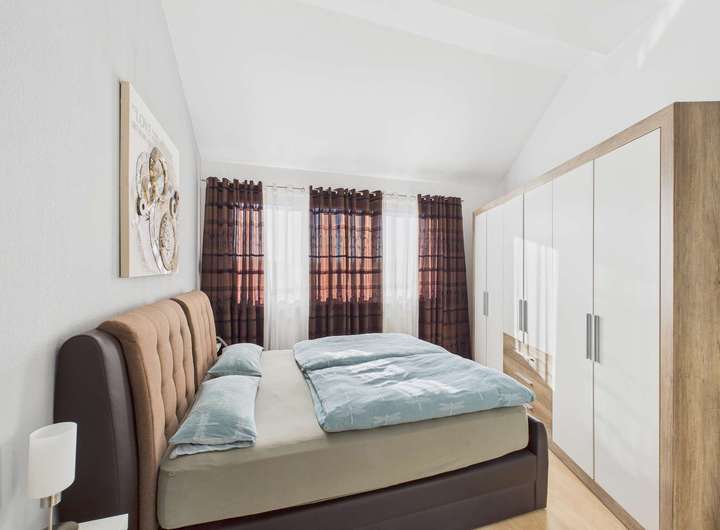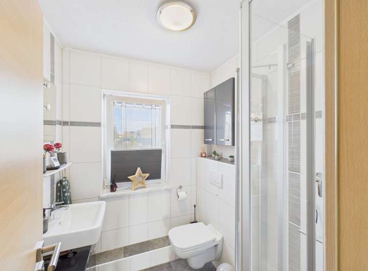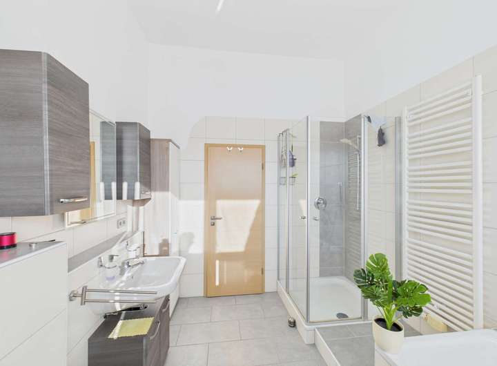 Im Obergeschoss haben Sie das Elternschlafzimmer und ein Kinder- oder Arbeitszimmer. Komplettiert wird der Schlafbereich durch das großzügige Tageslichtbad mit Wanne und separater Dusche im modernen Design und das Gäste-Duschbad.