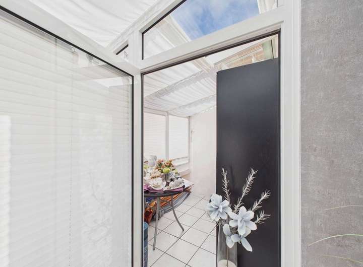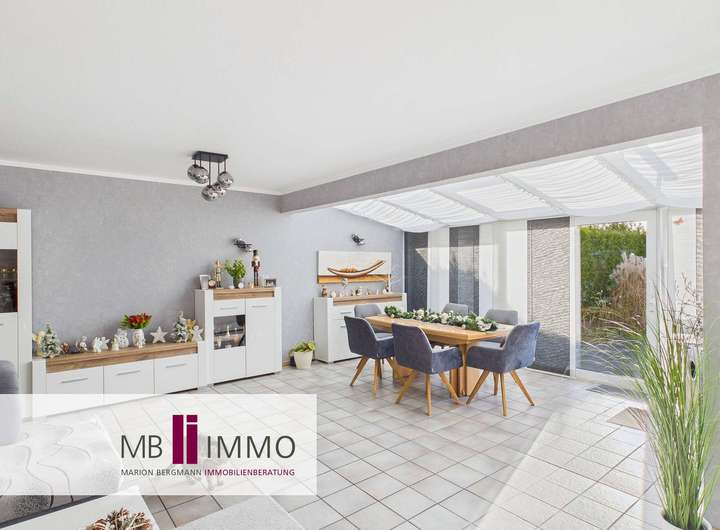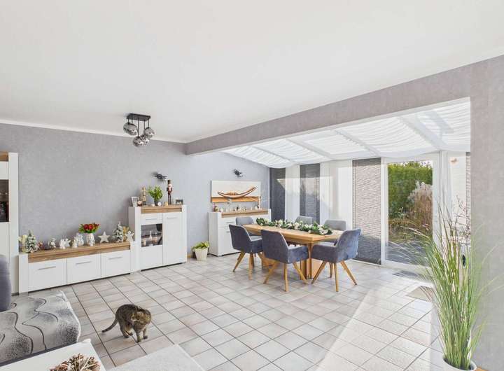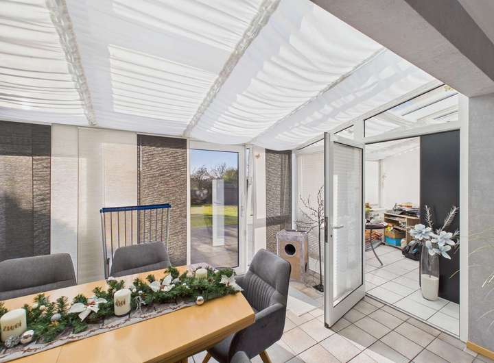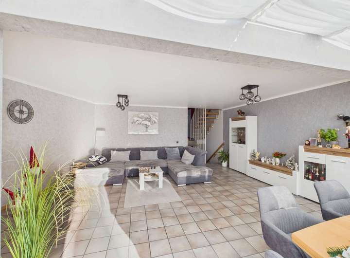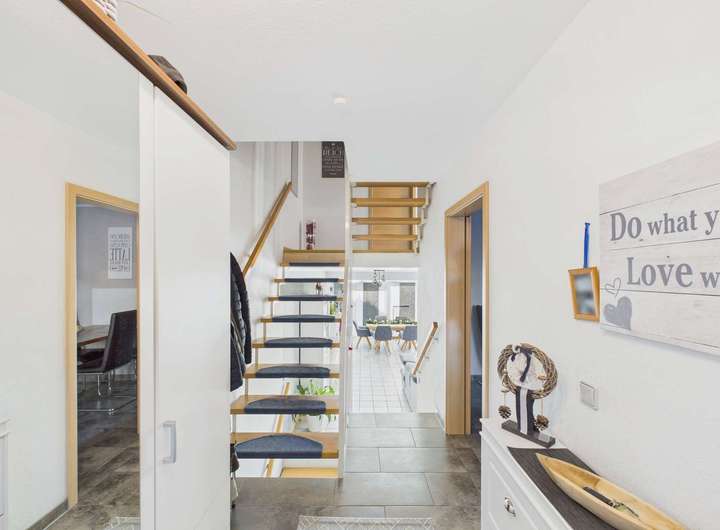 Die Haustür öffnet sich in den Flur. Gleich rechts geht es in die Küche. Links führt die Treppe ins Obergeschoss. Geradezu betreten Sie das große Wohnzimmer. Zur Gartenseite geht der Wohnraum in den Wintergarten über. Hier ist der ideale Platz für den großen Esstisch, an dem sich Familie und Freunde treffen und von dem man den Blick in den Garten genießen kann. Ein kleines Arbeitszimmer befindet sich direkt neben dem Wintergarten. Auch von hier aus können Sie in den pflegeleicht angelegten Garten schauen.