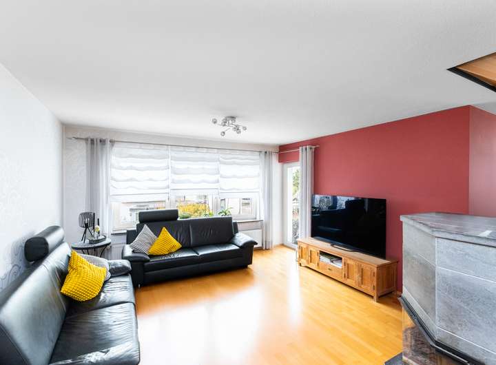 Im ersten Obergeschoss befindet sich ein lichtdurchfluteter Wohn- und Essbereich, dessen Kamin sofort eine warme, heimelige Atmosphäre schafft – ideal für Familienabende oder gemütliche Wintertage. Von hier aus gelangen Sie in die hochwertige Einbauküche sowie auf einen herrlichen Balkon, der 2024 mit hochwertigen, pflegeleichten Fliesen erneuert wurde. Zwei flexibel nutzbare Zimmer sowie ein Gäste-WC runden diese Ebene perfekt ab.