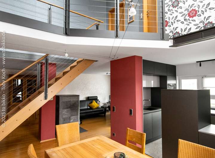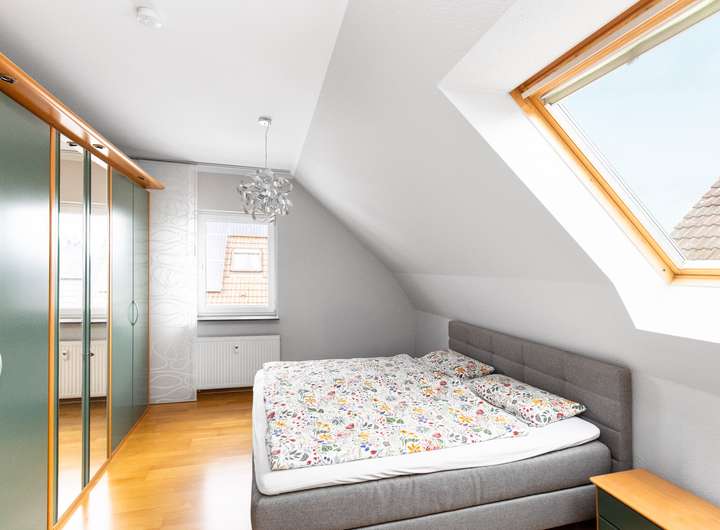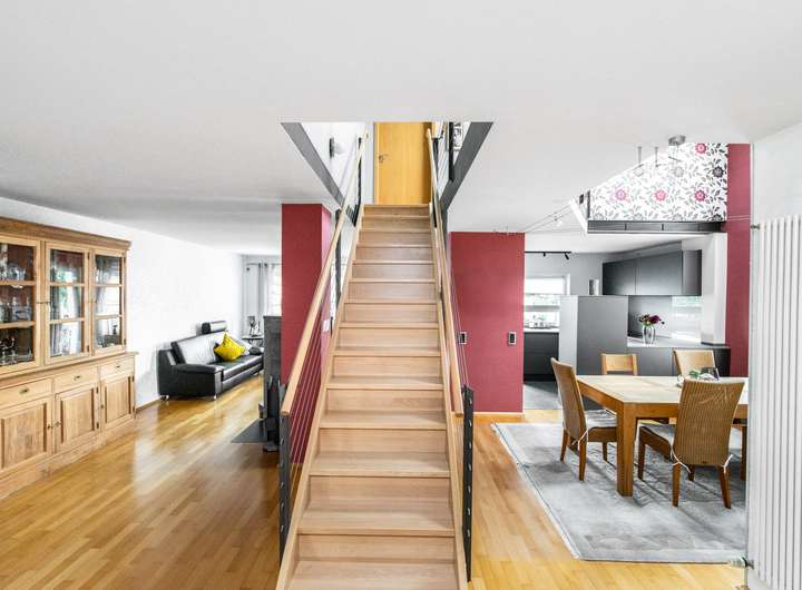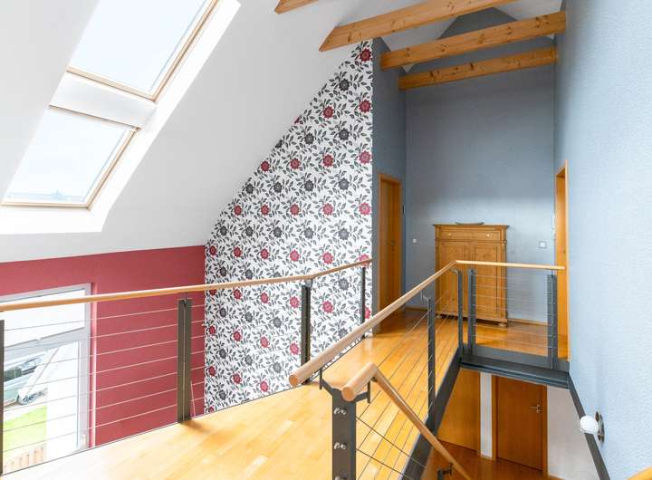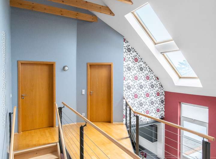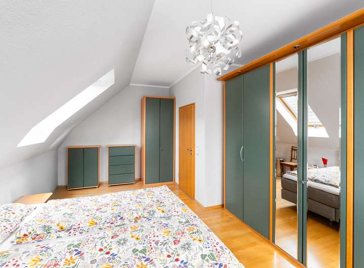 Die zweite Wohneinheit erstreckt sich über das erste Obergeschoss und das ausgebaute Dachgeschoss und bildet damit ein großzügiges Familiennest.