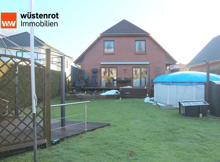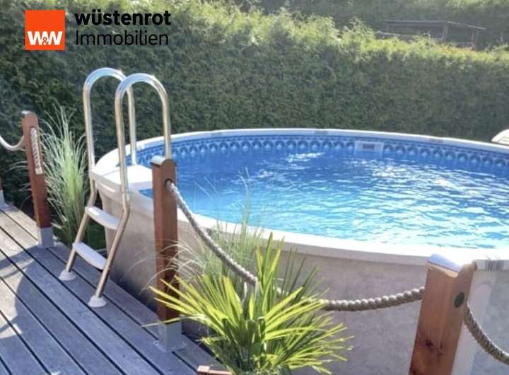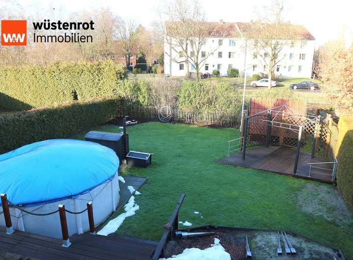 Vom geräumigen Wohn-/Esszimmer aus erschließt sich der sonnige Garten mit großzügiger Terrasse und viel Platz zum Spielen und Verweilen. Ein mobiler Außenpool sorgt im Sommer für erholsame Abkühlung.
