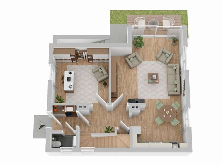 Der Zugang zum Haus erfolgt über einen Windfang, von dem aus ein Gäste-WC mit Fenster erreichbar ist. Zudem befindet sich auf dieser Ebene ein Büro, welches sich auch als Gäste- oder weiteres Schlafzimmer nutzen lässt.