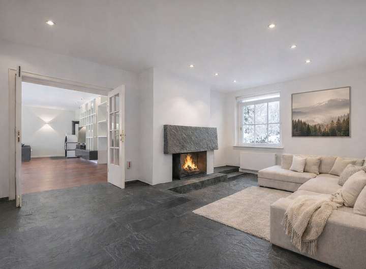 Im Erdgeschoss befinden sich ein offener Wohn- und Essbereich mit Kaminecke, Zugang zur Südterrasse, ein Schlafzimmer mit Bad en suite sowie ein Gäste-WC. Das modernisierte Obergeschoss umfasst vier Schlafzimmer, Küche, Bad und eine Loggia. Eine neu ausgebaute Atelierwohnung erweitert das Raumangebot.