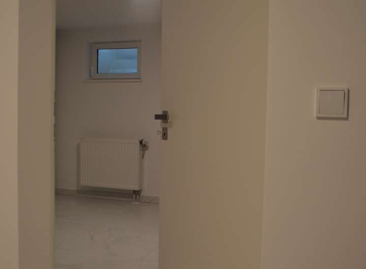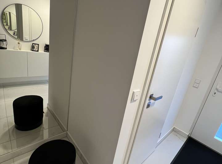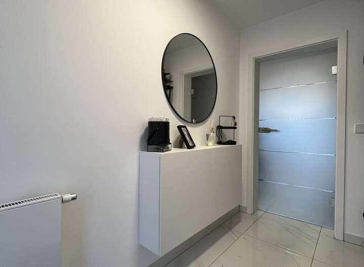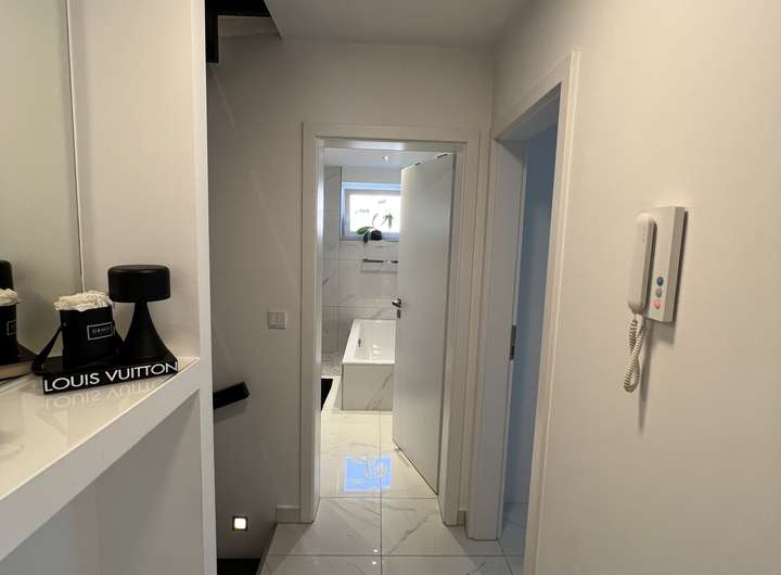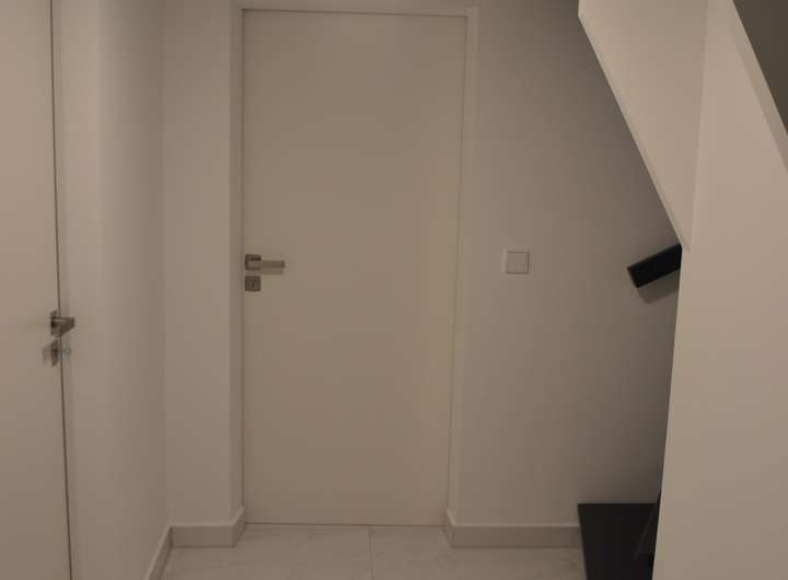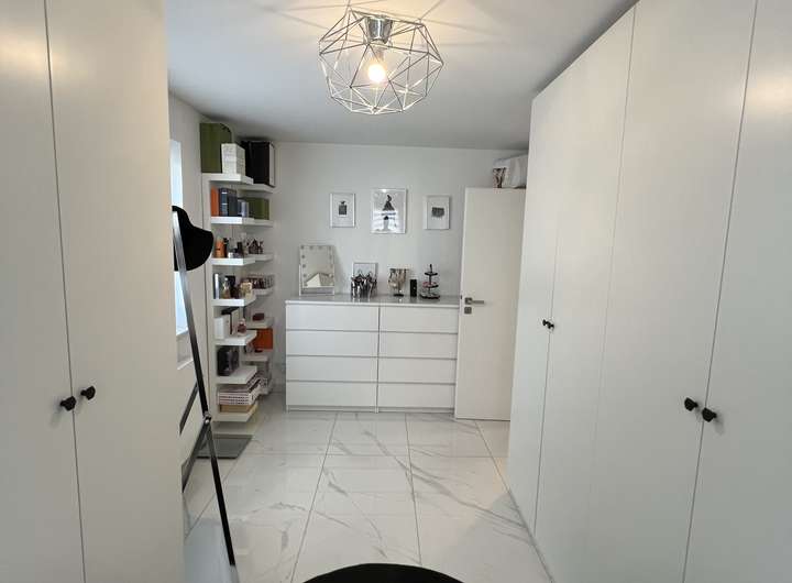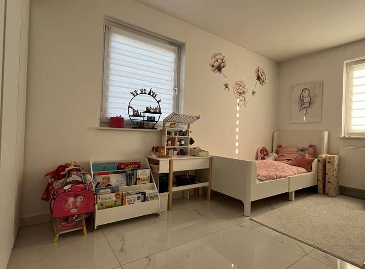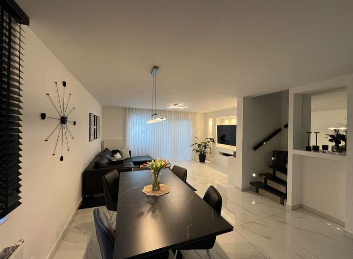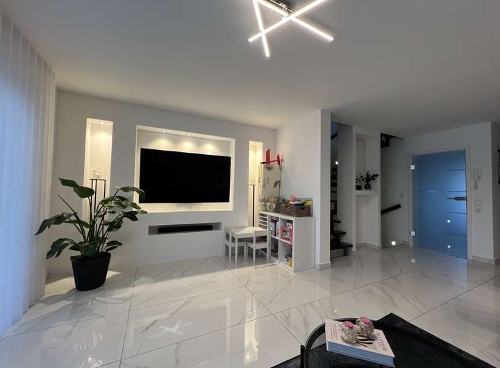 • Erdgeschoss: Eingangsbereich mit Garderobe, Gäste-WC, offene Wohnküche mit Essbereich und Zugang zur Terrasse und zum Garten. Im Wohnzimmer sorgt eine stilvolle Wohnwand aus Gipskarton mit integrierten LED-Spots für stimmungsvolles Ambiente