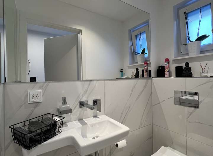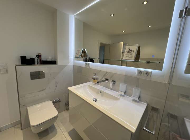 • 1. Obergeschoss: Zwei Schlafzimmer, ein Büro/Arbeitszimmer sowie ein hochwertiges Badezimmer mit ebenerdiger Dusche, Badewanne, wandhängendem WC, Waschbecken, Designer-Handtuchheizung und eleganten Unterputzarmaturen