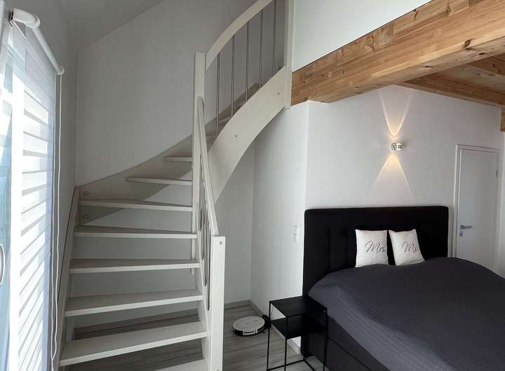 • Dachgeschoss: Ein weiteres Schlafzimmer mit eigenem Duschbad & WC sowie zwei Balkonen; eine Treppe führt in den ausgebauten Spitzboden mit Galerie-Charakter