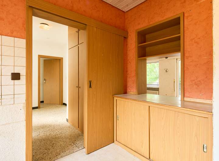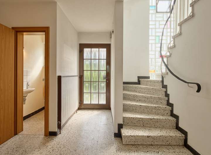 Der großzügige Eingangsbereich bietet Zugang zu einem Tageslicht-Gäste-WC, der Küche mit praktischer Durchreiche sowie dem lichtdurchfluteten Wohn- und Essbereich mit direktem Zugang zur Terrasse und dem idyllischen Garten.
