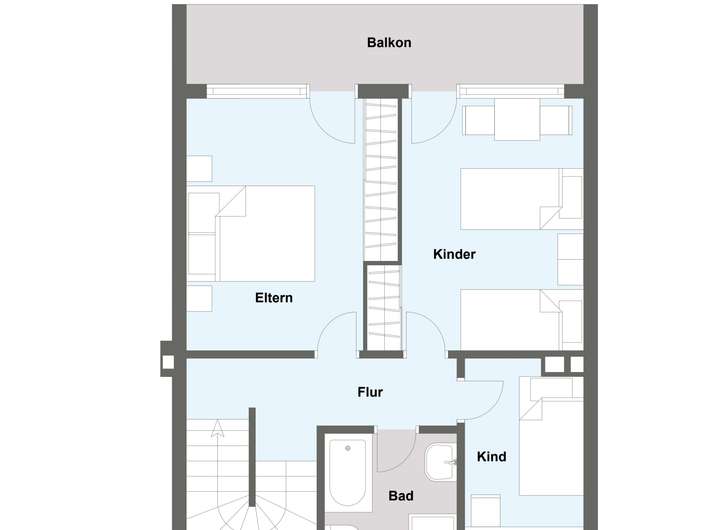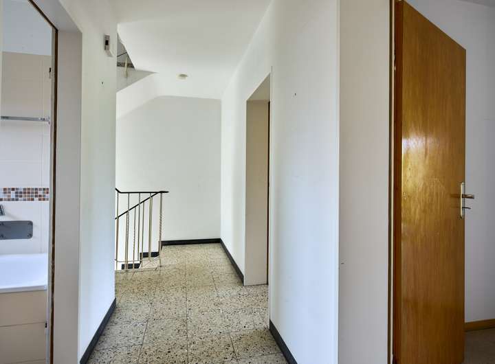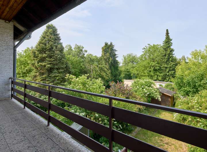 Im Obergeschoss befinden sich zwei geräumige Schlafzimmer, beide mit Zugang zu einem gemeinsamen Balkon, ein Tageslichtbad mit Wanne und Dusche sowie ein weiteres Zimmer, das sich ideal als Ankleidezimmer oder Kinderzimmer eignet.
