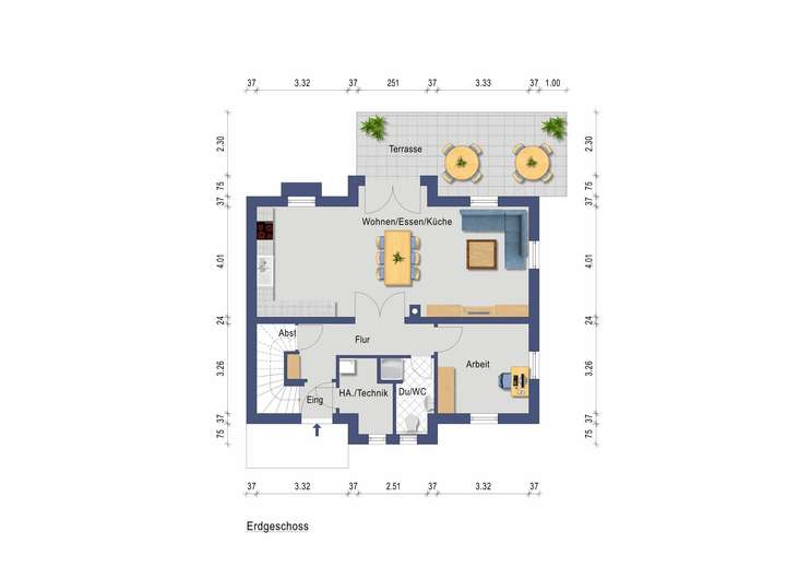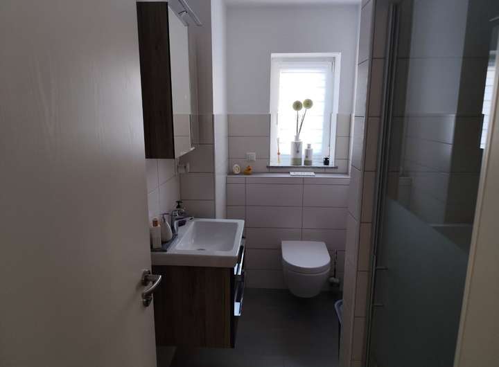 Im Erdgeschoss befindet sich, neben dem Hauswirtschaftsraum, ein Gäste WC mit Dusche, ein Schlafzimmer sowie der geräumige und lichtdurchflutete Küchen-, Ess- und Wohnbereich.