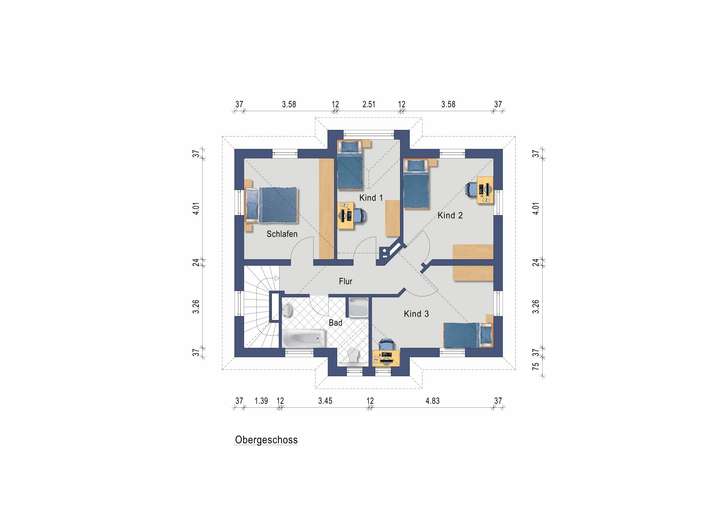 Das Obergeschoss verfügt über vier Zimmer, die als Schlaf-, Kinder- und Arbeitszimmer genutzt werden können, sowie ein weiteres Badezimmer.
