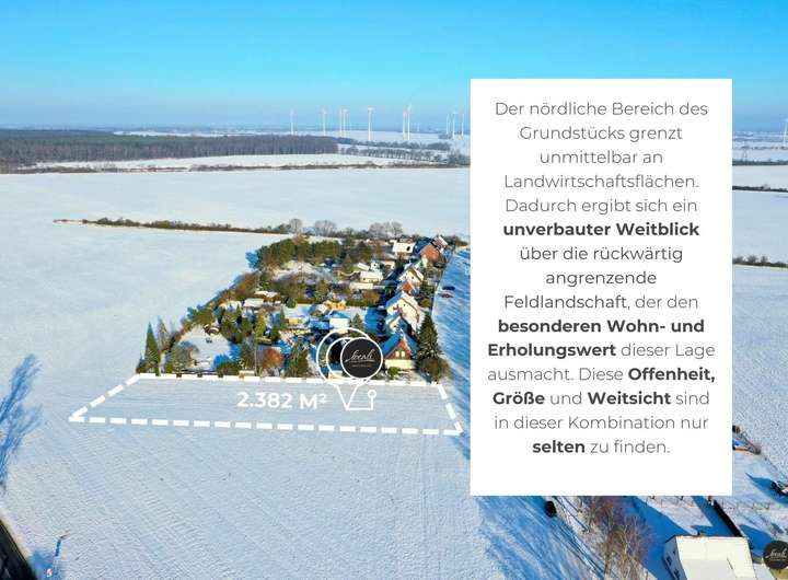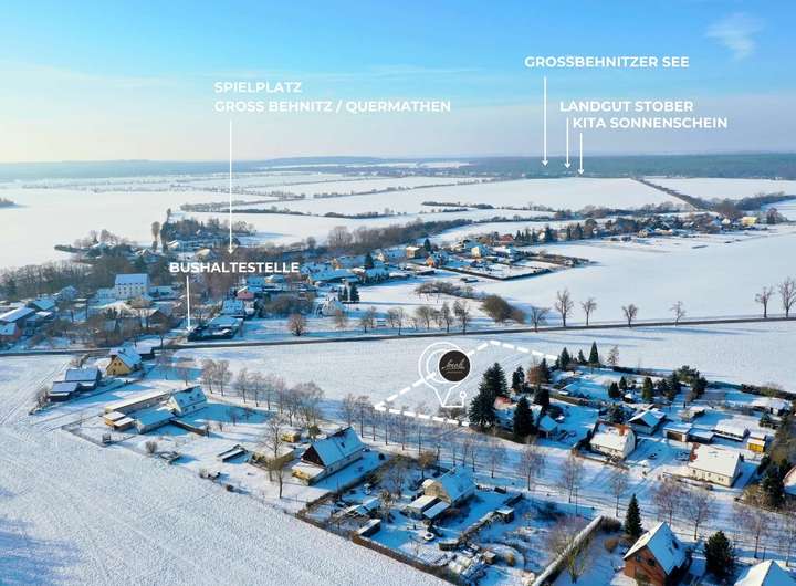 Das Umfeld ist geprägt von einer überschaubaren, gewachsenen Nachbarschaft, straßenbegleitender Einfamilienhausbebauung sowie weitläufigen landwirtschaftlichen Flächen. Rückwärtig öffnet sich ein weiter, nahezu unverbauter Blick über die offene Feldlandschaft - ein seltenes Qualitätsmerkmal in dieser Größenordnung. Der Groß Behnitzer See sowie das Landgut Stober mit Parkanlage, Gastronomie und Veranstaltungen sind in ca. 2,4 km auch bequem mit dem Fahrrad erreichbar.
