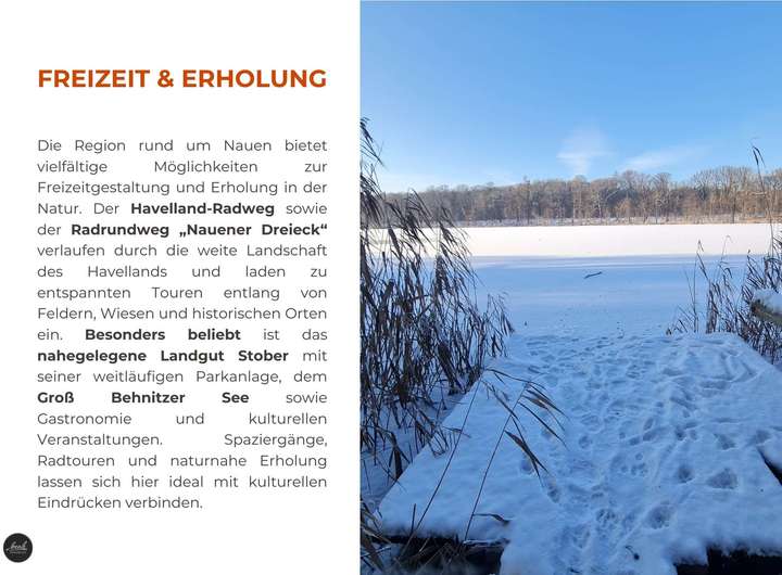 Spaziergänge, Radtouren und Naturerlebnisse beginnen hier direkt vor der Haustür. Besonders hervorzuheben ist das Landgut Stober am Groß Behnitzer See, das in ca. 9 Minuten mit dem Fahrrad bzw. in ca. 3 Minuten mit dem Auto erreichbar ist. Die Parkanlage, Gastronomie und kulturellen Veranstaltungen machen die Umgebung zusätzlich attraktiv.