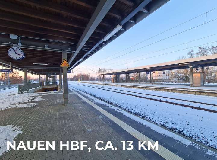 Die örtliche Infrastruktur umfasst u. a. eine Kita, eine Arztpraxis, einen Sportplatz, einen Spielplatz, ein Dorfgemeinschaftshaus sowie weitere Einrichtungen des täglichen Lebens. Ergänzende Versorgungs- und Einkaufsmöglichkeiten befinden sich in der nahegelegenen Stadt Nauen (ca. 9,7 km bis zum Stadtzentrum) und den umliegenden Orten. Insgesamt zeichnet sich die Lage durch eine gelungene Verbindung aus einem offenen Landschaftsbild, historischer Identität und städtischer Nähe aus: Ein Umfeld, das besonders für Familien und Bauherren attraktiv ist, die naturnah wohnen möchten, ohne auf städtische Nähe zu verzichten.