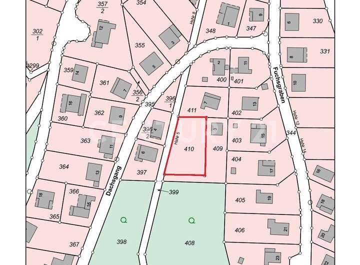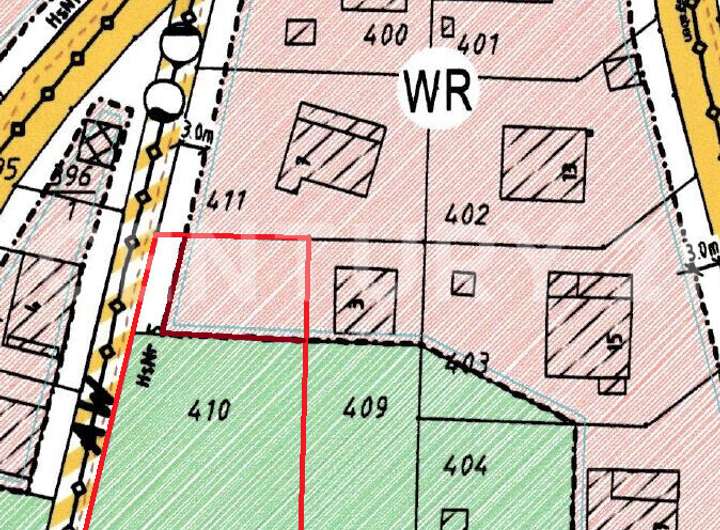Die Grundfläche darf laut Bebauungsplan maximal 100 m² betragen. Das tatsächliche Baufenster (abzüglich der 3 m Abstand zu den beiden Nachbargrundstücken) beträgt 91 m².