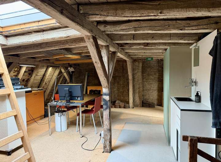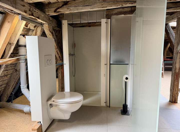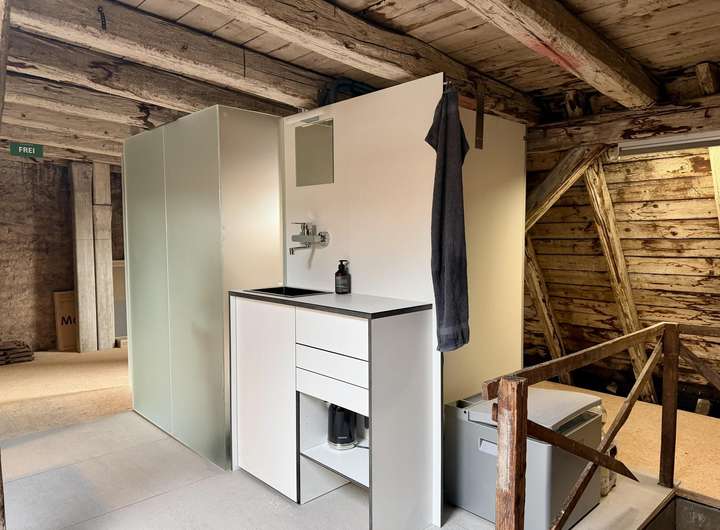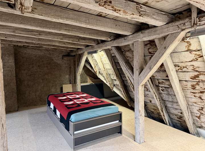 Das Dachgeschoss wurde teilweise ausgebaut, sodass es einen Rückzugsort bspw. für Handwerker bietet und als zusätzliches Lager dient.
