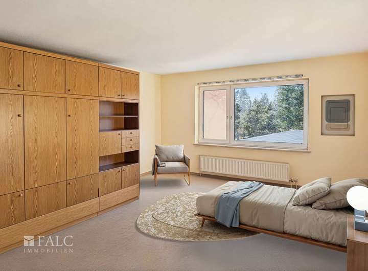 Die Möbel im Wohnzimmer, in der Wohnküche und dem Kinderzimmer, sind digital gestaltet worden. Die Beschaffenheit der Räume ist komplett original belassen.