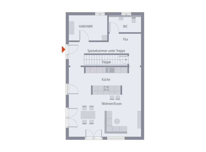 Das ist unser Doppelhaus 05. Hier sind in den jeweils knapp 80 m² großen Erdgeschossen die Übergänge fließend - und sorgen auf diese Weise für ein außergewöhnliches Wohnerlebnis. Das zentral gelegene Treppenhaus trennt Eingangsbereiche beziehungsweise Nutzräume mit HWR und Gäste-WC von dem hellen Wohn-Koch-Ess-Bereich, der mit seiner Größe von mehr als 45 m² den Mittelpunkt des Hauses bildet. Im Obergeschoss: ein Elternschlafzimmer mit integrierter Ankleide, zwei Kinderzimmer sowie ein Badezimmer mit Wanne, Dusche und WC.