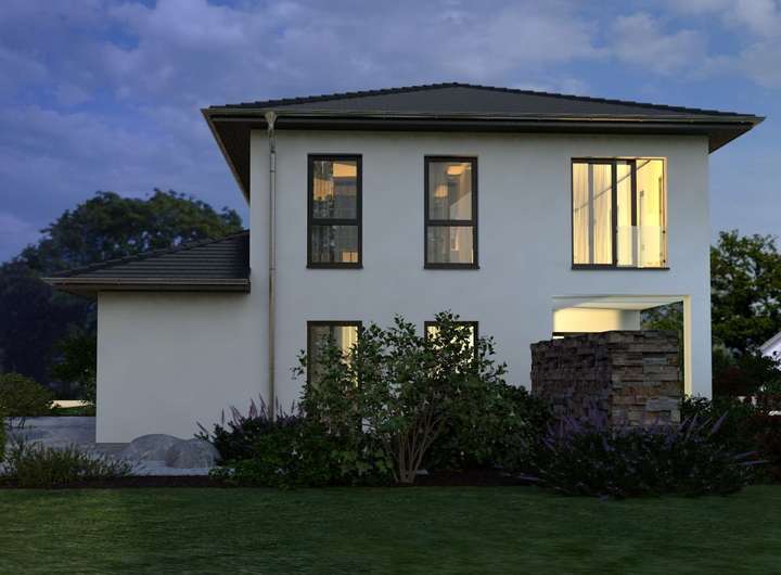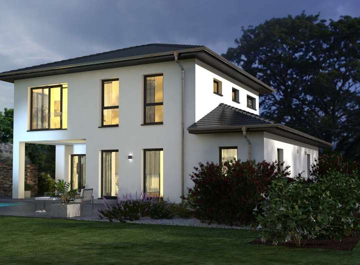 Die Staffelvilla mit Walmdach imponiert mit klarer Struktur. Die reduzierte Formgebung wird architektonisch durch das zweiseitig zurückgestufte Obergeschoss und den Terrassenrücksprung im Erdgeschoss ansprechend ergänzt. Dieser verbindet übergangslos drinnen mit draußen und ist sowohl vom offenen Wohn- als auch vom Essbereich zugänglich. Durch den großzügigen Baustil erhält das Erdgeschoss einen exklusiven Bungalowcharakter. Die halbgewendelte, zentral in den Wohnraum integrierte Treppe führt in die obere Etage. Dort runden der luxuriöse Elternbereich mit Bad en suite, zwei Kinderzimmer sowie ein weiteres Dusch-WC das großzügige Raumangebot ab. OKAL-Standard: ca. 2,80 m Deckenhöhe in beiden Etagen und reichlich Lichteinfall dank bodentiefer Rundum-Verglasung.