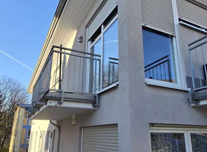 Die obere Wohnung verfügt über zwei Balkone im 1.Obergeschoss, die von der Küche bzw. dem Wohnzimmer begehbar sind. Zudem gibt es auf dieser Etage ein Tageslichtbad. Im Dachgeschoss befinden sich die beiden Schlafzimmer der Wohnung. Zudem gibt es von einem Zimmer einen Zugang per Treppe auf den gedämmten Spitzboden.
