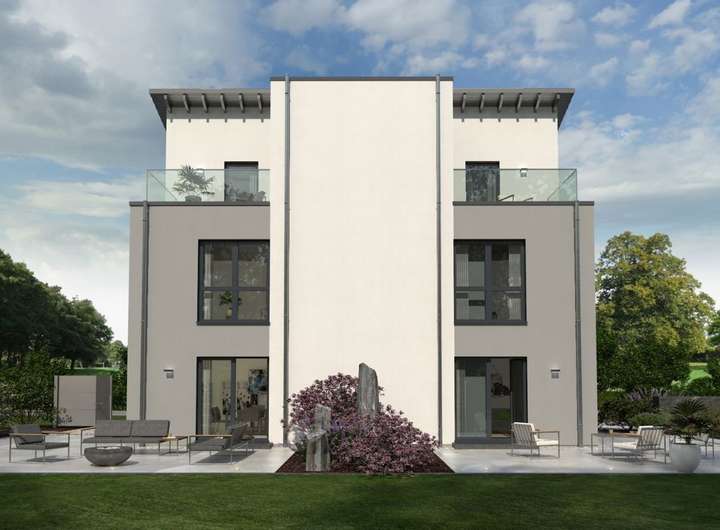 Eine geringe Grundfläche bei maximalem Wohnkomfort - das bietet unser Doppelhaus 08 und eignet sich damit perfekt für kleine Grundstücke. Das dreigeschossige Gebäude mit Pultdach überzeugt nicht nur durch sein durchdachtes Raumkonzept, sondern auch mit einer außergewöhnlichen Architektur, die sich bereits in der Fassadengestaltung zeigt: Durch die symmetrische Bauweise mit einem erkerartigen Vorsprung, der die beiden baugleichen Wohneinheiten optisch voneinander trennt, entstehen im zweiten Obergeschoss sichtgeschützte Balkone, die nach einem anstrengenden Tag zum Relaxen einladen. Ein Ort zum Zusammenkommen, Kochen, Austauschen und Genießen ist das Erdgeschoss mit offenem Wohn-Ess-Koch-Bereich. Zudem im Parterre: HAR, HWR und Gäste-WC. Das erste Obergeschoss ist zugleich das Reich der Kinder: Zwei Zimmer und ein großes Bad stehen hier zur Verfügung. Unter dem Pultdach haben die Eltern ihren Rückzugsort - mit Schlaf- und Arbeitszimmer und direktem Zugang zum Balkon. Mehr Wohnen geht nicht.