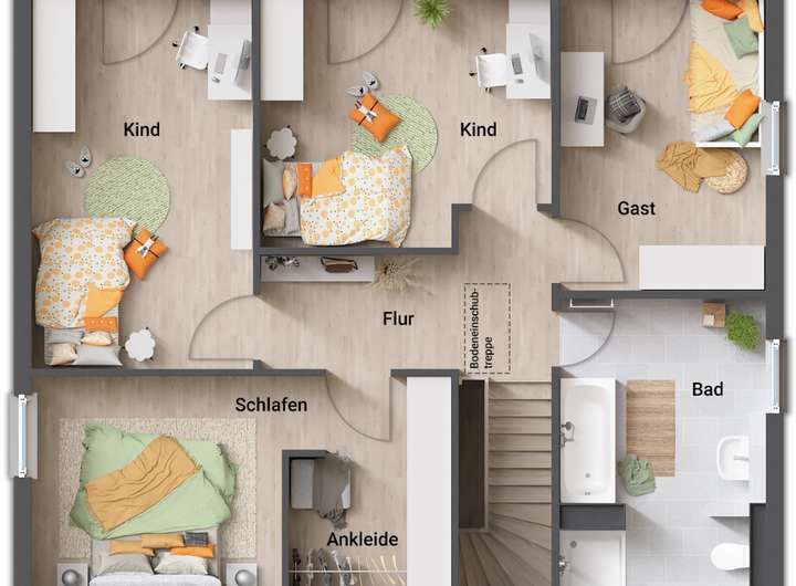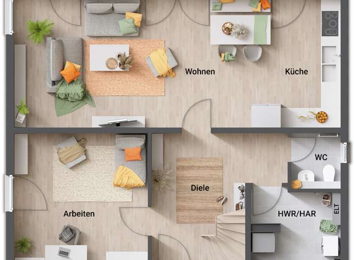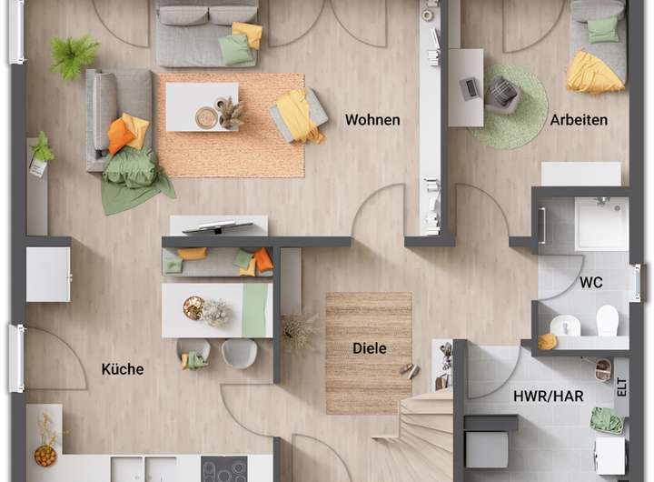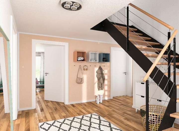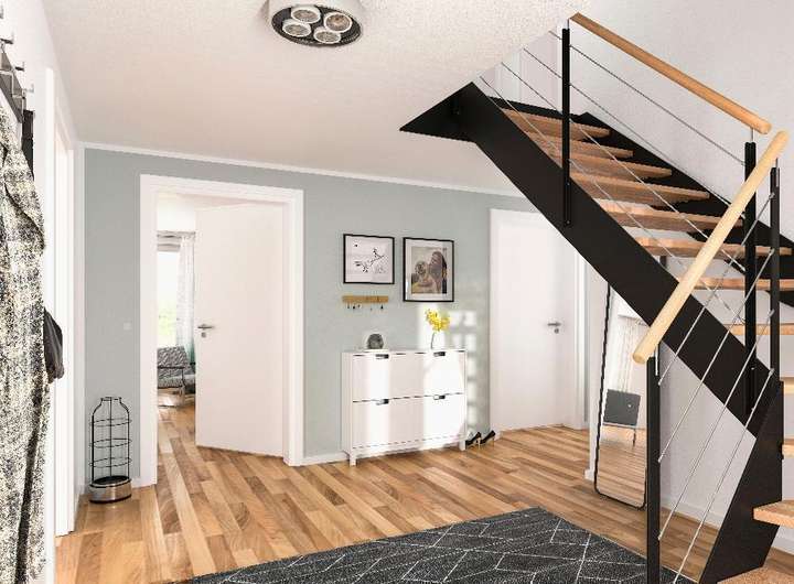Ihr Haus wird schlüsselfertig übergeben, d.h. Sie gestalten nur noch die Innenwände in Ihrer Lieblingsfarbe und verlegen die übrigen Bodenbeläge!