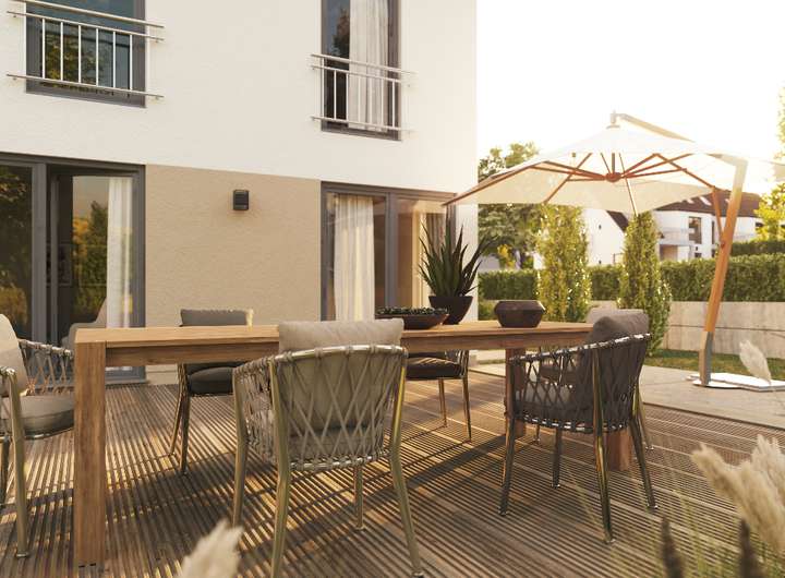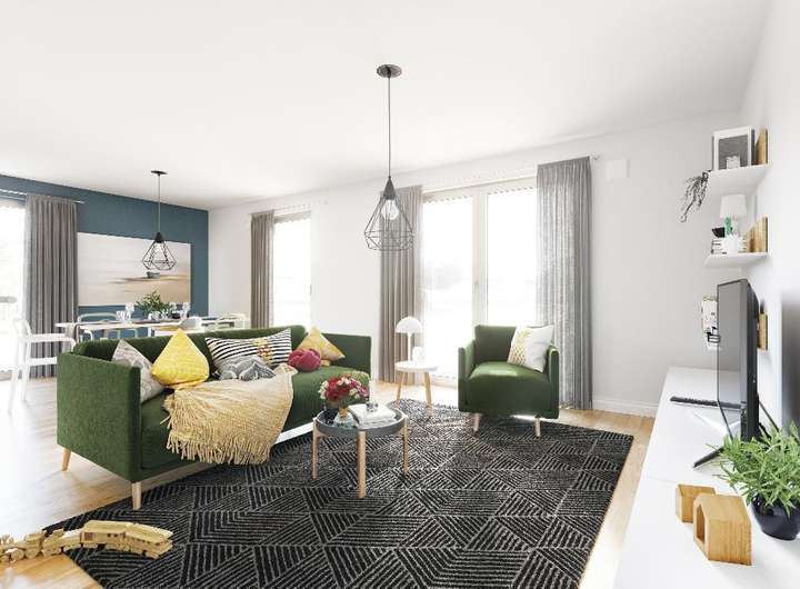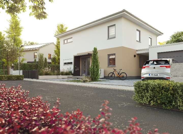 Unsere große Stadtvilla Flair 152 spiegelt mit seinen klaren Linien das urbane Lebensgefühl seiner Bewohner wieder. Sie überzeugt mit einem cleveren Grundriss und einer schicken, modernen Optik. Zentrum des Familienlebens ist das helle und geräumige Wohnzimmer mit gemütlichem Essbereich. Von hier aus können Sie direkt in die offene Küche blicken und schauen, was in den Töpfen köchelt. In der Küche haben Sie genug Platz für gemeinsame Kochabende mit den Liebsten oder ein schnelles Frühstück unter der Woche. Wer hin und wieder lieber im Home-Office arbeitet, kann sich neben dem Wohnzimmer ein großzügiges Arbeitszimmer einrichten. Auch das Obergeschoss zeigt sich im gradlinigen Baustil des Hauses. Hier finden Sie ein Schlafzimmer mit geräumiger Ankleide und wahlweise zwei oder drei zusätzliche Zimmer (6 Zimmer möglich), die Sie nach Ihren Vorstellungen als Schlaf-, Kinder- oder Gästezimmer nutzen können. Große Fenster lassen auch hier viel Tageslicht hineinströmen. Das Stadthaus Flair 152 ist gradlinig und schick – einfach optimal für das moderne Wohnen in Stadtnähe.