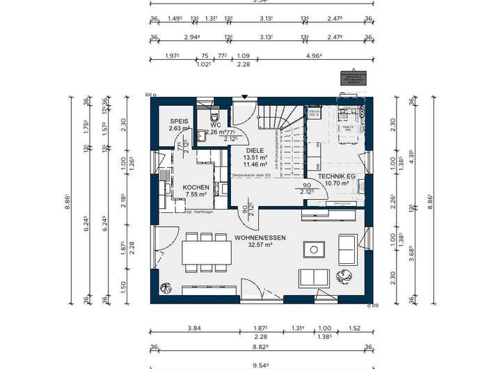In diesem Haus erwartet Sie eine funktionale Gestaltung, die Ihren Komfort und Ihre Bedürfnisse in den Vordergrund stellt. Das Erdgeschoss präsentiert eine geschickte Raumaufteilung mit einer kompakten Küche, die genügend Platz für kulinarische Kreationen bietet, sowie einem großzügigen Wohnzimmer mit Essbereich, in dem Sie entspannte Stunden mit Ihren Liebsten verbringen können.