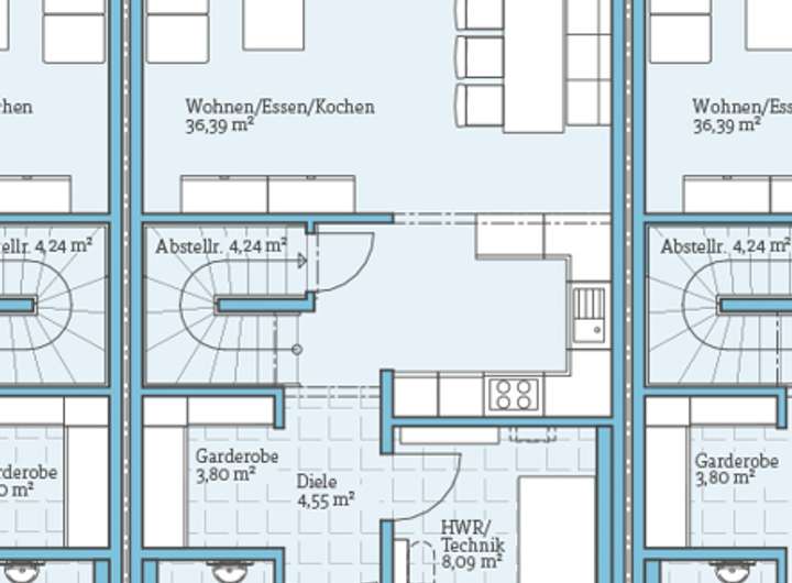 Zusätzlich bietet das EG eine Diele, eine Garderobe, eine Speisekammer unter der Treppe, einen HAR/HWR (8 m²) und ein Gäste-WC.