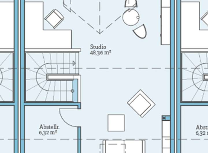 Das DG bietet ein großes Studio mit ca. 48 m² für ein bis zwei Zimmer, je nach Wunsch und zusätzlich noch einen Abstellraum (über 6 m²).