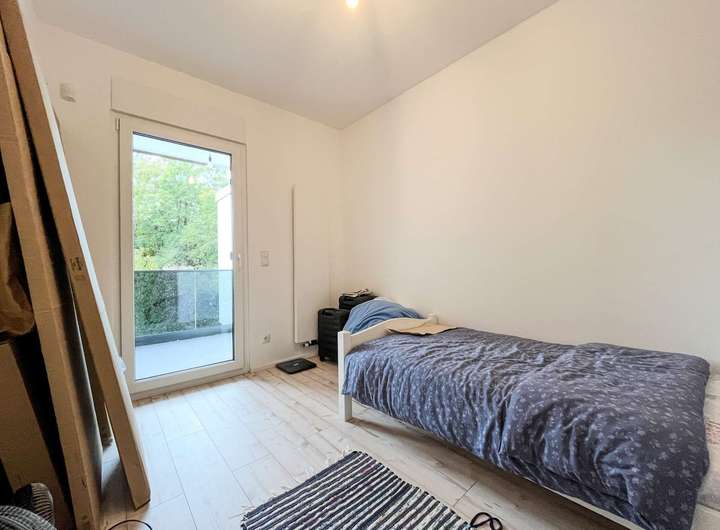 Das erste Obergeschoss überzeugt mit einem zentralen Flur, der durch ein Oberlicht angenehm hell wirkt. Hier befindet sich das stilvolle Badezimmer, ausgestattet mit einer modernen Luxus-Regendusche. Das Schlafzimmer bietet direkten Zugang zum Balkon und schafft so einen privaten Rückzugsort im Freien. Zwei weitere Zimmer ergänzen die Etage – eines davon ebenfalls mit Balkonzugang, das andere mit bodentiefen Fenstern, die für ein offenes, helles Wohngefühl sorgen.