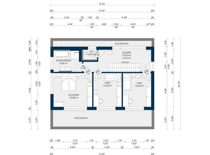 Das Erdgeschoss überzeugt mit einer geräumigen Diele, die den Zugang zu allen Bereichen ermöglicht. Das angrenzende Arbeitszimmer bietet einen ruhigen Rückzugsort für konzentriertes Arbeiten. Der Technik- und Hauswirtschaftsraum sorgt für praktische Lösungen im Alltag und ist über eine in der Wand geschobene Tür direkt mit der Küche verbunden. Im Dachgeschoss eröffnet sich eine lichtdurchflutete Galerie, von der aus sich alle Räume erschließen: das komfortable Elternschlafzimmer, zwei Kinderzimmer sowie ein großzügiges Badezimmer mit Badewanne, Dusche und Doppelwaschbecken.