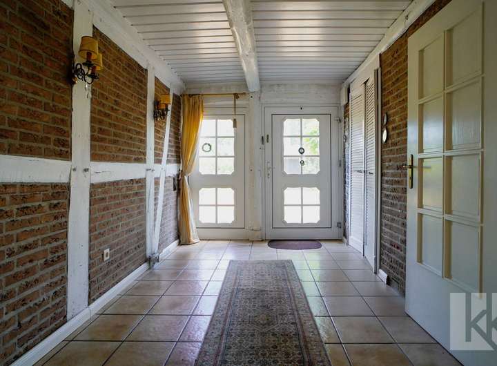 Es erwartet Sie zunächst der Flur mit separater Garderobe und einem großen Badezimmer mit Badewanne. Dann finden Sie sich in der Diele mit dem schönen alten Kamin wieder und schauen in Ihre Küche mit Zugang zur Terrasse. Über eine angrenzende Speisekammer gelangte man früher in die andere Wohneinheit. Heute ist dieser Übergang geschlossen.