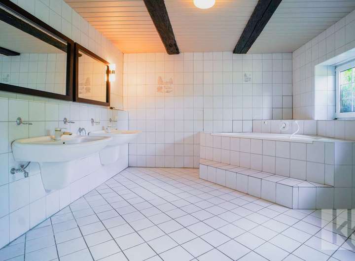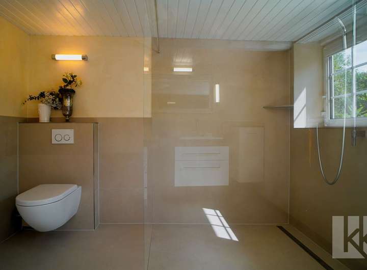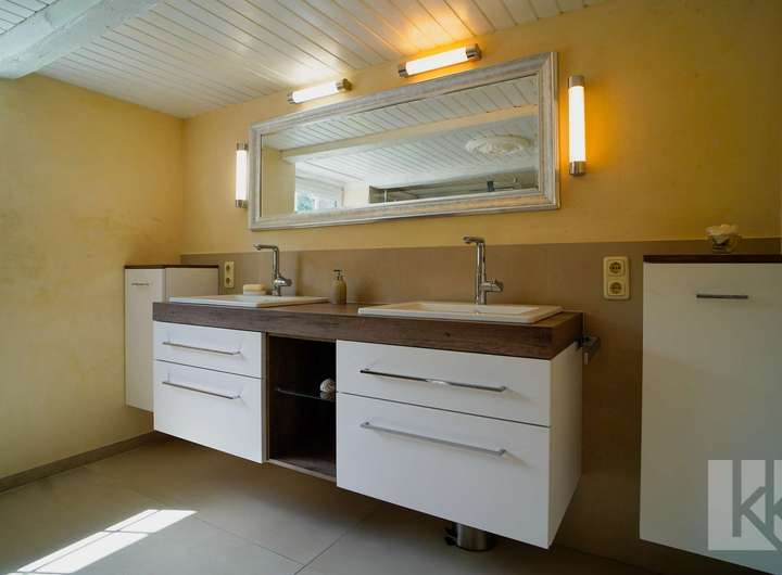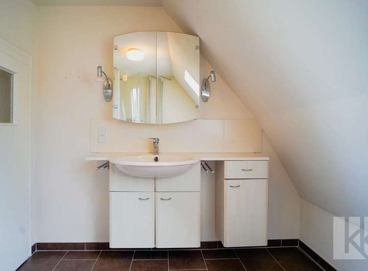 Das zusätzliche Badezimmer mit Doppelwaschtisch und ebenerdiger Dusche wurde im Jahr 2020 modern saniert.