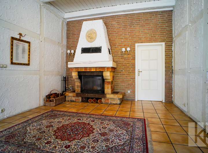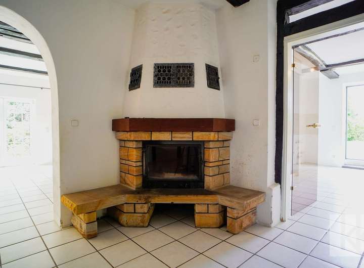 Sie erreichen nach dem Eingangsbereich mit Gästebad und Dusche direkt den großzügigen Wohn- und Essbereich mit seinen sehr hohen Decken und einem fest eingebauten Kamin.