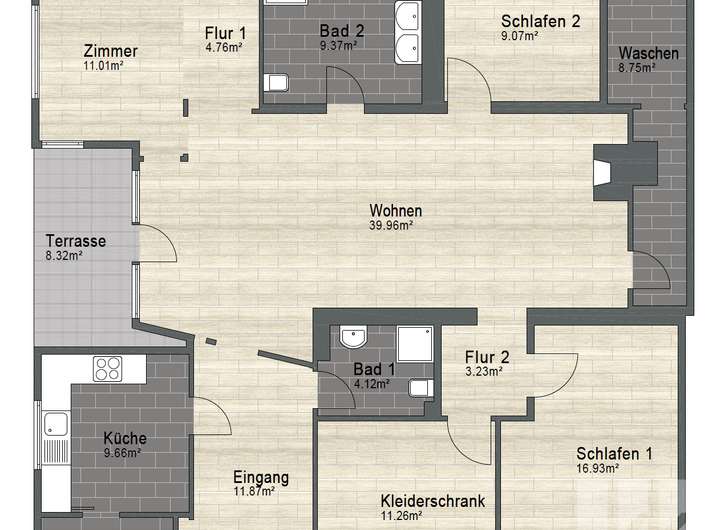 Die erste Wohneinheit verfügt über eine Wohnfläche von 145 m² und ist nahezu barrierefrei gebaut. Die zweite Wohneinheit erstreckt sich über zwei Etagen und verfügt über 205 m² Wohnfläche.