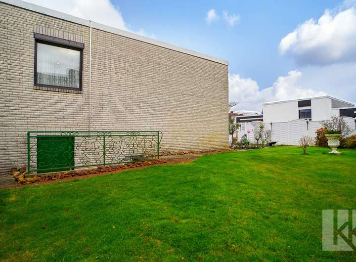 Charakteristisch für diesen Bungalow ist die Staffelgeschoss-Bauweise, bei der beide Etagen versetzt angeordnet sind und durch wenige Stufen, sowohl nach oben, als auch nach unten miteinander verbunden sind.