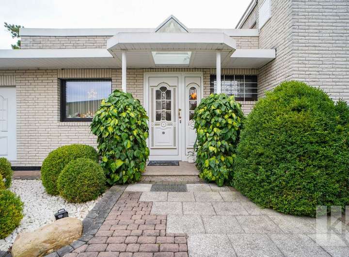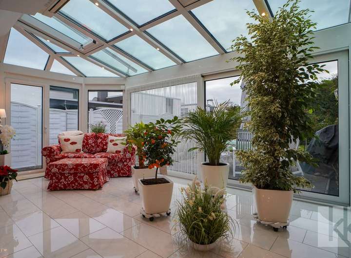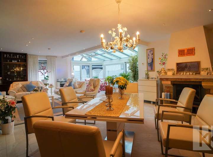 Durch den Eingangsbereich mit Gäste-WC gelangen Sie über die große Diele in die helle, geschlossene Küche, den Treppenbereich, der in beide Ebenen des Hauses führt und in den großzügigen Wohn- und Essbereich, der über einen Zugang in den herrlichen Wintergarten und in den Garten verfügt. Darüber hinaus ist der Wohnbereich mit einem Kamin ausgestattet und bietet Ihnen viel Platz für gemütliche Familienabende. Die bodentiefen Fenster und der Wintergarten geben dem Wohnraum ein helles und offenes Wohngefühl.