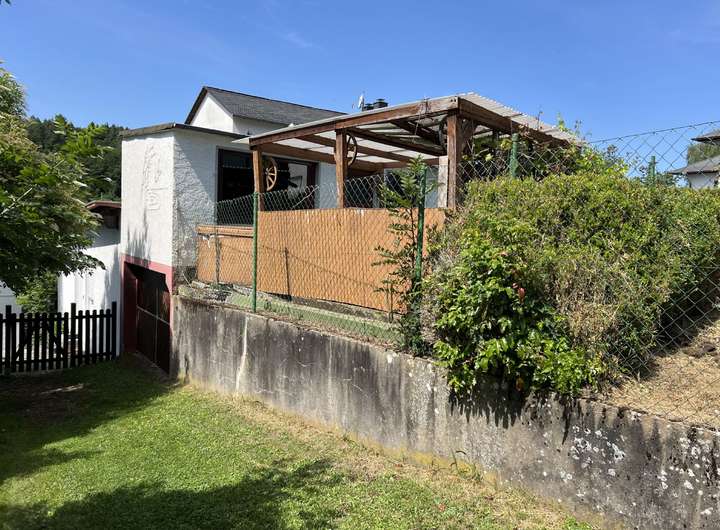 Flurstück 63 mit Gartenhaus und überdachtem Freisitz. Unter dem Gartenhaus befindet sich deckungsgleich die Garage, mit Zufahrt über das Flurstück 64.