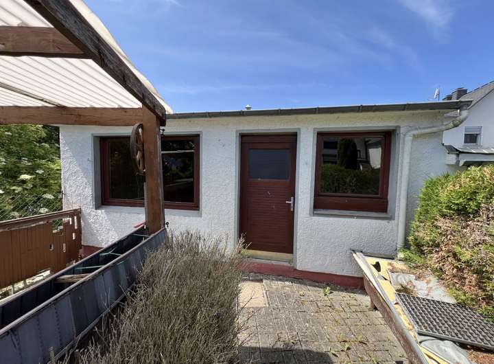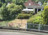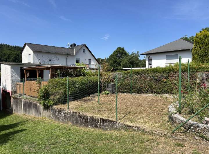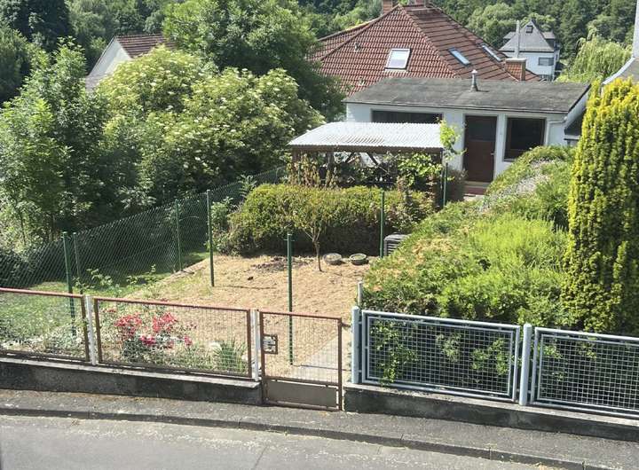 Dieses kleine, aber feine Gartengrundstück liegt zentral im Ortskern von Braunfels-Neukirchen. Vor dem Grundstück verläuft die Hauptstraße, seitlich grenzt ein öffentlicher Weg an, der zur darunterliegenden Garage führt.
