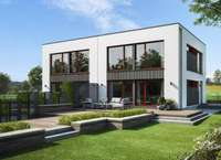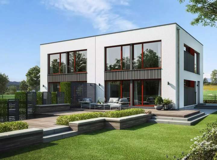 Wer den puristischen Bauhausstil mag, wird dieses Doppelhaus lieben. Die Basis des Entwurfs bildet ein kubischer Baukörper, der mit Abmessungen von 10,045 m x 7,40 m viel Platz im Innern bietet. Wer mehr Raum benötigt, kann das Fertighaus auch mit verschiedenen Architektur-Bauteilen - etwa Erker oder Balkonen - erweitern.