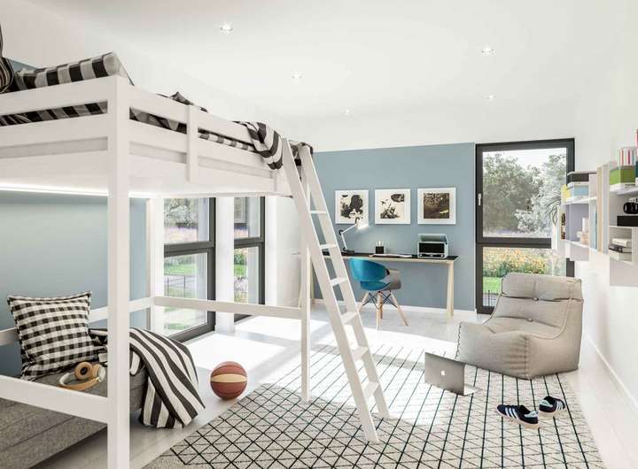 Auf beiden Ebenen öffnen großzügige Fensterfronten das Gebäude seiner Umgebung. An den Seiten wurden hohe Brüstungsgeländer vor die raumhohen Verglasungen gesetzt. Betreten wird das stylishe Doppelhaus über einen kompakten Windfang. Hier können schon einmal die Schuhe und die Jacken ausgezogen werden, bevor man weiter in das Innere vordringt. Rechts schließt sich die Gästetoilette an. Über einen offenen Durchgang gelangt man in den Flur, in den sich der Treppenaufgang harmonisch integriert. Er mündet in den großzügigen Wohn-, Ess- und Kochbereich, der dank der breiten Fensterfront mit Tageslicht geflutet wird. Besonders praktisch ist der zweite Zugang zur Küche. So kann man die schweren Wochenendeinkäufe auf kurzem Weg zu den Vorratsschränken bringen. Bei der Küchengestaltung sind die zukünftigen Hausbesitzer flexibel: Auf den mehr als 6 m² lässt sich sowohl eine L-förmige Küchenzeile als auch eine U-förmige Küche mit Theke realisieren. Serviert werden die Speisen auf dem großen Esstisch vor der raumhohen Festverglasung. Von hier aus eröffnet sich ein wundervoller Ausblick ins Grüne. An warmen Tagen kann das gemeinsame Essen auch nach draußen auf die weitläufige Terrasse verlagert werden. Das Obergeschoss steht ganz im Zeichen von Ruhe und Entspannung. Um eine Empore gruppieren sich zwei geräumige Kinderzimmer, der Elternschlafraum sowie ein Wellnessbad für Groß und Klein. Abgerundet wird das Raumangebot des Doppelhauses von einer Abstellkammer sowie einem Technikraum.