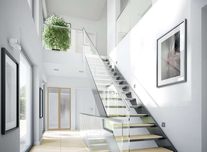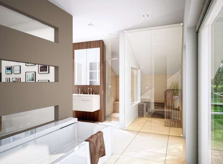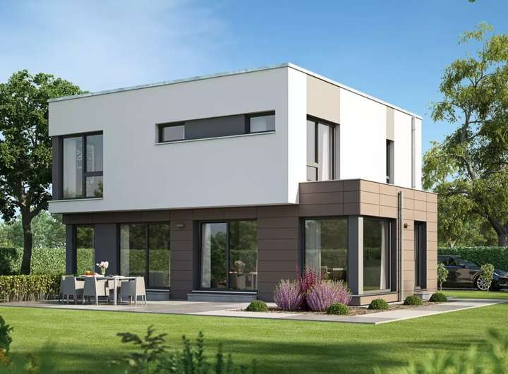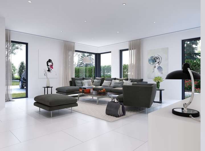 Wie kein anderer Stil steht die Bauhaus-Architektur für modernes, komfortables und vor allem lichtdurchflutetes Wohnen. Als Musterbeispiel könnte diese kubische Villa gelten. Auf der rechten Seite wurde ein asymmetrischer Rechteck-Erker mit großzügiger Übereck-Verglasung hinzugeplant. Der Grundriss ist perfekt auf die Bedürfnisse einer vierköpfigen Familie abgestimmt. Im Inneren des Hauses werden die Bewohner und Besucher von einer repräsentativen Diele empfangen, in die sich eine viertelgewendelte Treppe integriert. Links schließen sich ein Gäste-WC und ein flexibel nutzbarer Raum an. Mit knapp 9 m² ist er nicht nur ein Traum für alle Selbstständigen und Angestellten, die regelmäßig von zu Hause arbeiten, sondern auch für Menschen mit platzintensiven Hobbys. Über einen breiten Durchgang schließt sich der weitläufige Wohn-, Ess- und Kochbereich an, der sich über die gesamte Hausbreite bis in den Erker hinein erstreckt. Raumhohe Verglasungen unterstreichen das luftige Ambiente und schaffen einen Bezug zur umliegenden Natur. Ob beim Kochen an der langen Kochinsel, beim Essen oder beim Entspannen auf der gemütlichen Couch: Von jedem Winkel aus kann man einen Blick in den Garten werfen. Ebenso großzügig und hell wie das Erdgeschoss präsentiert sich die obere Etage. Der Nachwuchs kann sich über zwei große Kinderzimmer freuen, den Eltern steht ein Schlafzimmer mit integrierter Ankleide zur Verfügung. Abgerundet wird das Raumprogramm von einem Familienbad mit Wellnesscharakter. Hier ist nicht nur Platz für eine bodengleiche Dusche, sondern auch für eine luxuriöse Whirlwanne. Wer möchte, kann sein Home-Spa zudem mit einer Sauna ausstatten.
