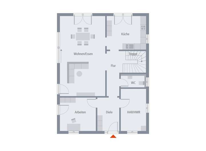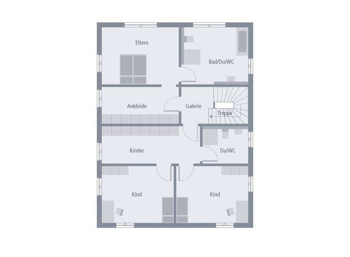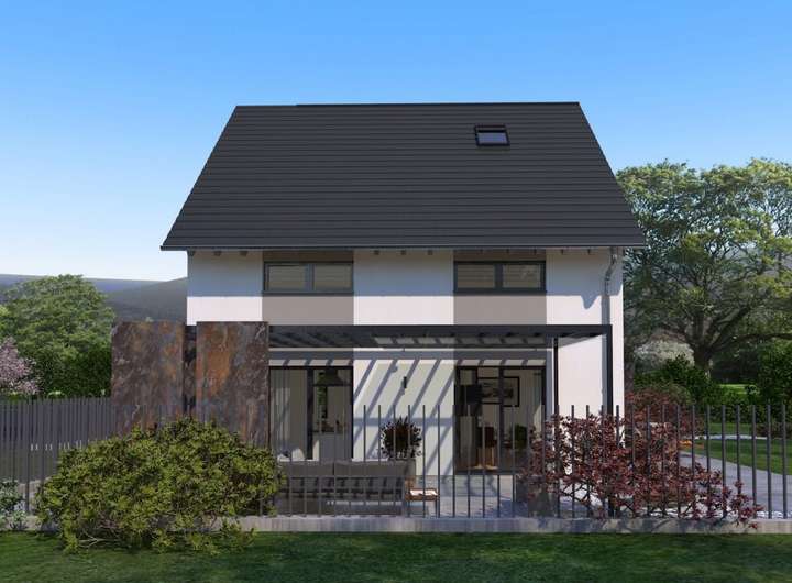 Die Fassade besticht durch ihre zweifarbige Gestaltung und die klare Form- und Liniengebung. Auch der überdachte Terrassenbereich auf der Gartenseite fügt sich optimal ein. Im Erdgeschoss dominiert der große Wohn-Ess-Bereich mit direktem Zugang zum Garten durch die große Schiebetür. Die Küche ist räumlich getrennt, ist aber direkt mit dem Esszimmer verbunden. Außerdem Parterre: Arbeitszimmer, Hauswirtschaftsraum sowie Gäste-WC. Das Dachgeschoss ist zweigeteilt: in das Wohlfühlparadies der Eltern - mit Schlaf- und Ankleidezimmer und einem geräumigen Bad mit Wanne, Dusche und WC - sowie in einen großen Bereich für die Kinder. Zwei Schlafzimmer, ein gemeinsamer Spielraum und ein Bad stehen zur Verfügung. Dank des Spitzbodens erstreckt sich die Wohnfläche über drei Etagen, wodurch im oberen Stockwerk ein perfekter Rückzugsort entsteht. Dort befindet sich ein großes Zimmer, das zum Arbeiten, für Kinder oder Gäste genutzt werden kann. Großes Plus: Auch hier gibt es ein eigenes Badezimmer. Design 30 bietet Wohnkomfort bis unters Dach.
