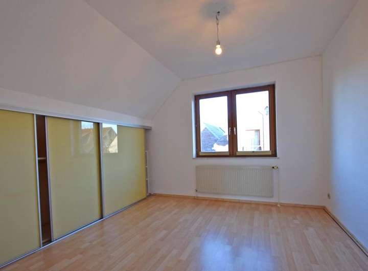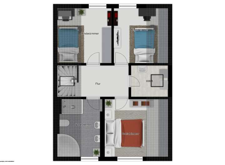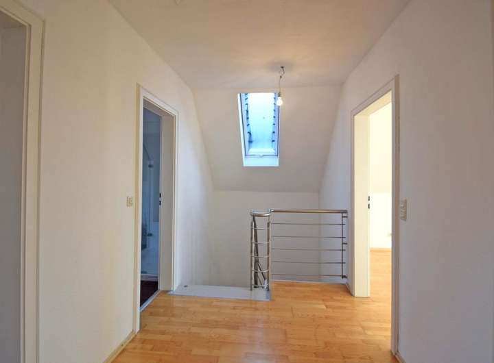 Über eine hochwertige freitragende Treppe gelangt man in das Dachgeschoss, in dem eine Betonzwischendecke verbaut ist. Hier können drei Schlafräume genutzt werden, von denen zwei Räume wie auch der Flur mit Parkett ausgestattet sind. Moderne Einbauschränke nutzen den Platz optimal. Das Familienbad ist mit einer Badewanne und einer Dusche ausgestattet. Dieser Raum verfügt über eine Fußbodenerwärmung. Ferner befindet sich im Dachgeschoss ein Hauswirtschaftsraum mit Waschmaschinenanschluss. Hier ist auch die Gaszentralheizung installiert. Der Dachboden ist begehbar und bietet eine enorme Abstellfläche.