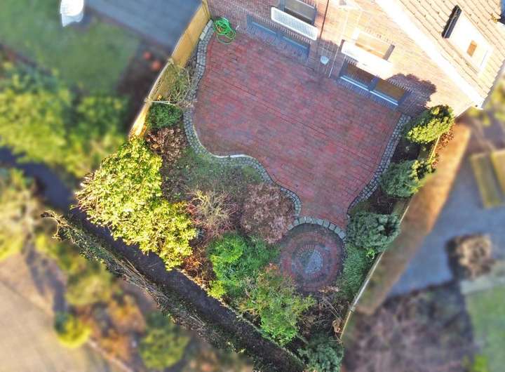 Der Garten ist mit hochwertigen Pflasterarbeiten aufwändig angelegt und strukturiert worden. Vor dem Haus befindet sich ein kleiner Schuppen für Fahrräder.